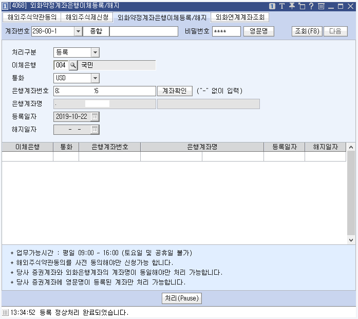 2. 유진 HTS 4068화면 외환출금용 은행계좌 등록