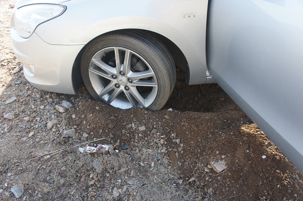 운전석쪽이 점점 낮은곳으로 밀리면서 하체 전체가 땅에 닿을지경이 됐네요